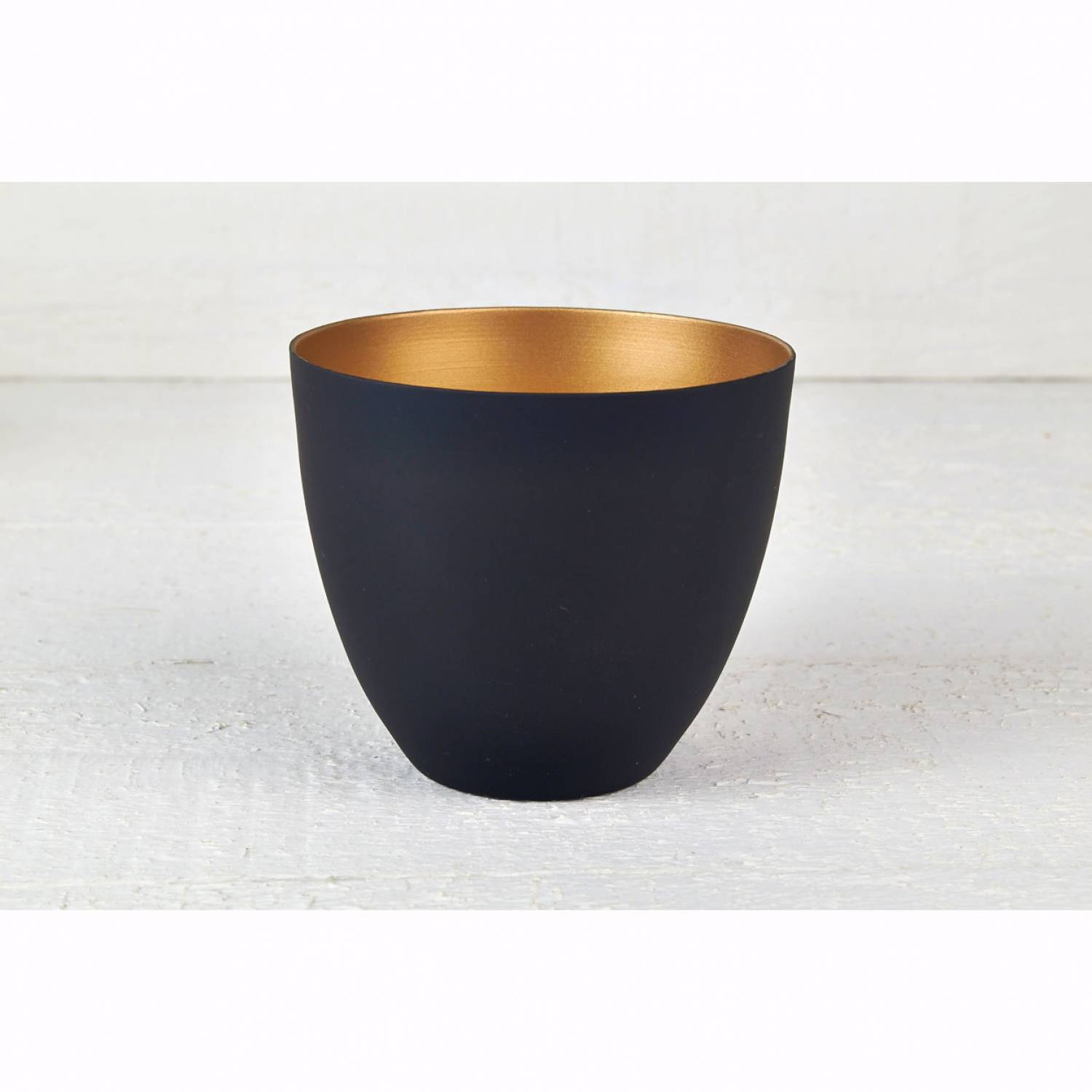 Teelichthalter der Serie Black Line - toller Becher für Teelichter aus feinstem Porzellan. Dieses Windlicht ist aussen schwarz und innen kupfer, das besondere Highlight in Ihrer Dekoration durch den Spiegeleffekt sobald Sie das Teelicht anzünden.