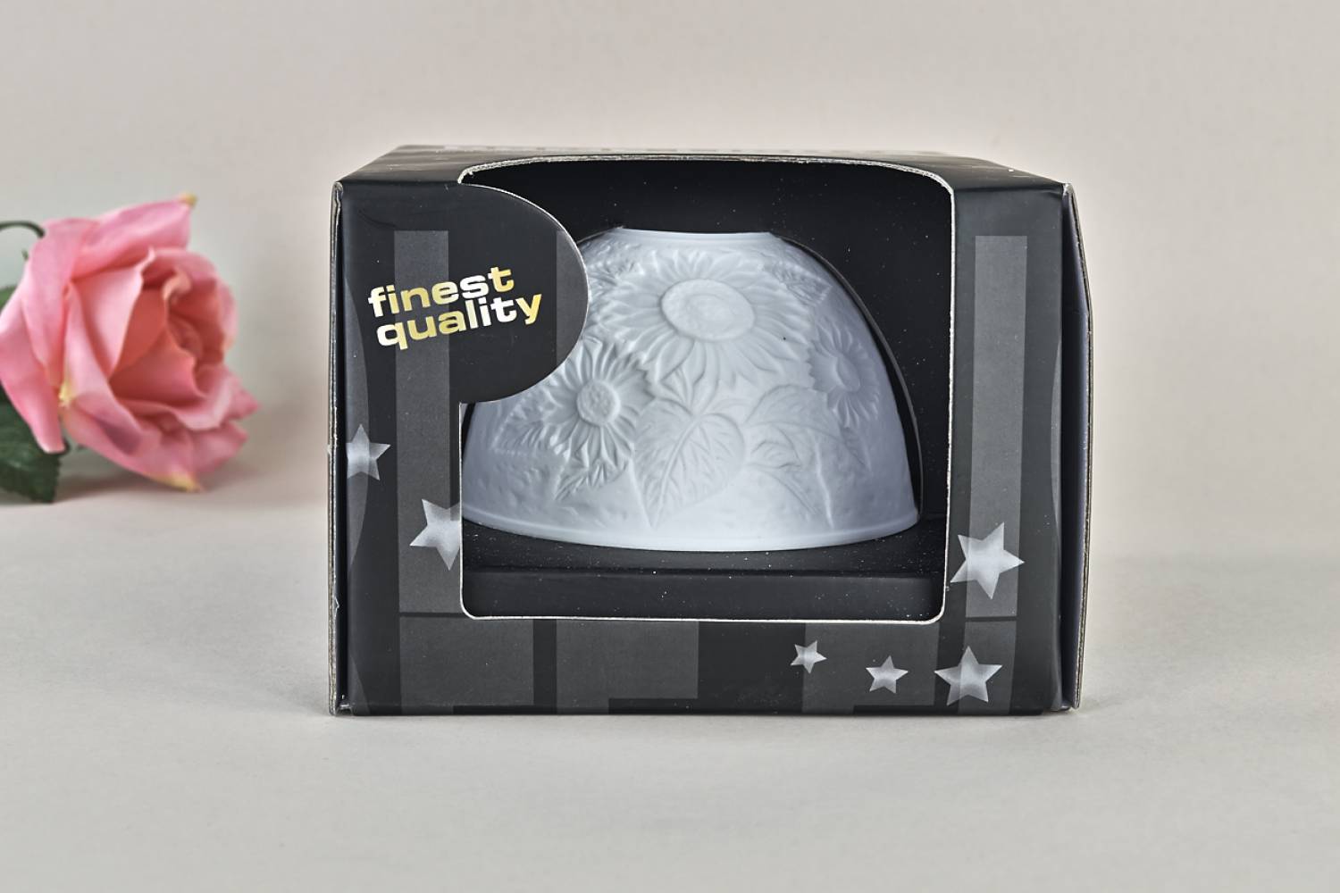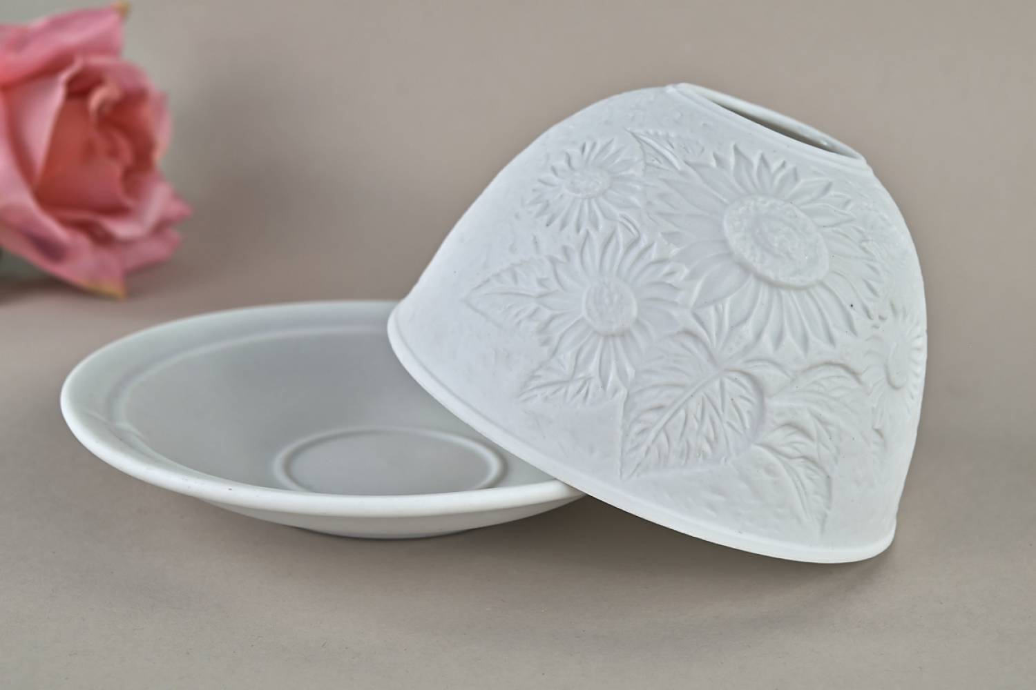 Dieser Teelichthalter aus Bisquitporzellan zeigt nach dem Motto: Sommer, Sonne, Sonnenblume.