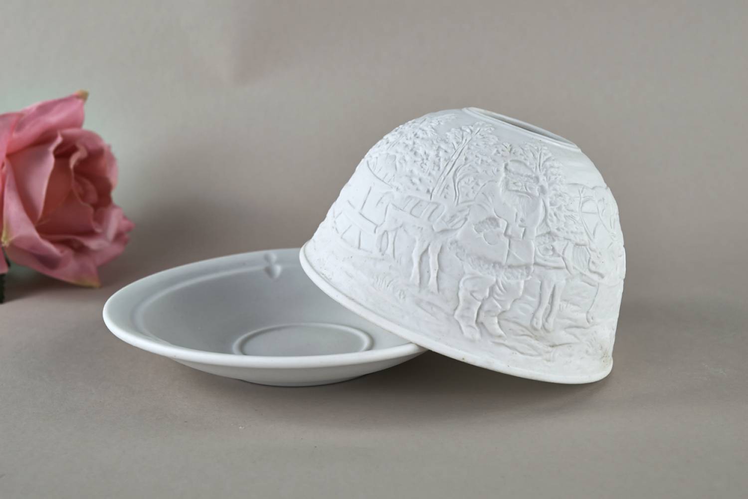 Dieser Teelichthalter aus Bisquitporzellan zeigt Knecht Rupprecht mit seinem Schlitten voller Geschenke.