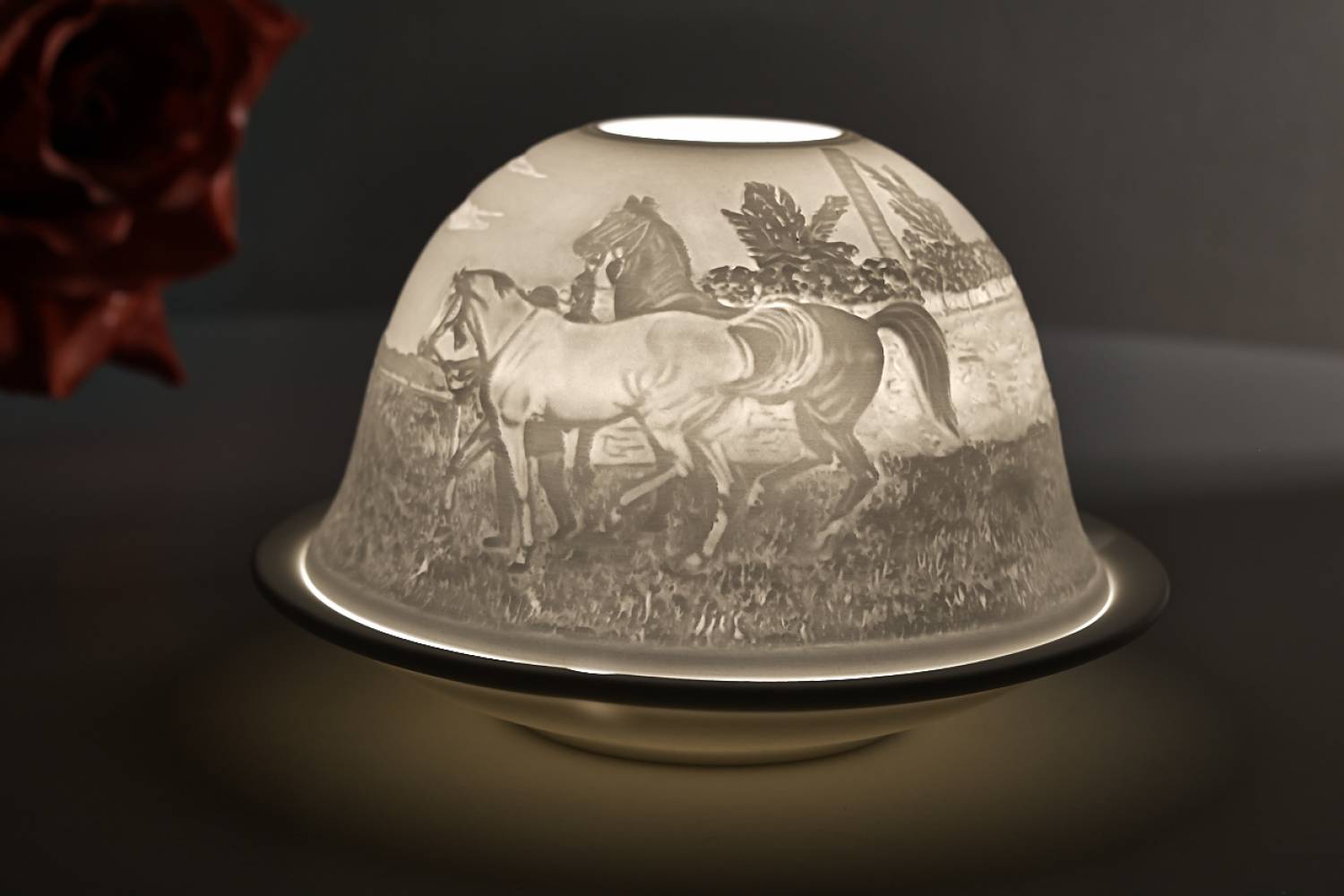 Dieser Teelichthalter aus Bisquitporzellan zeigt Pferde auf der Weide.