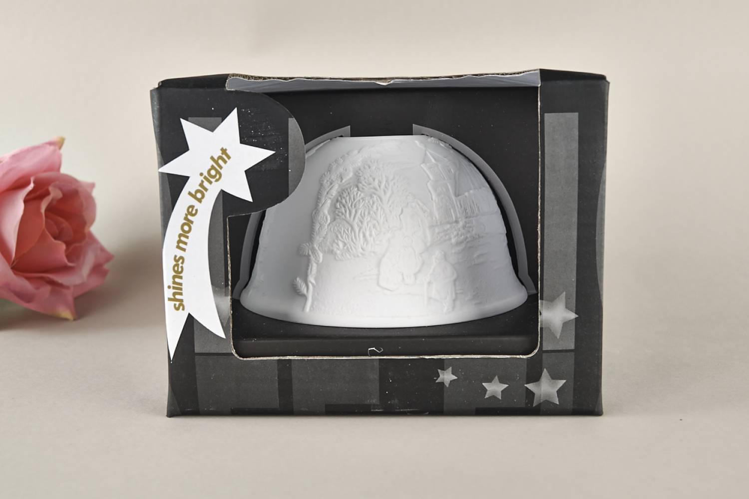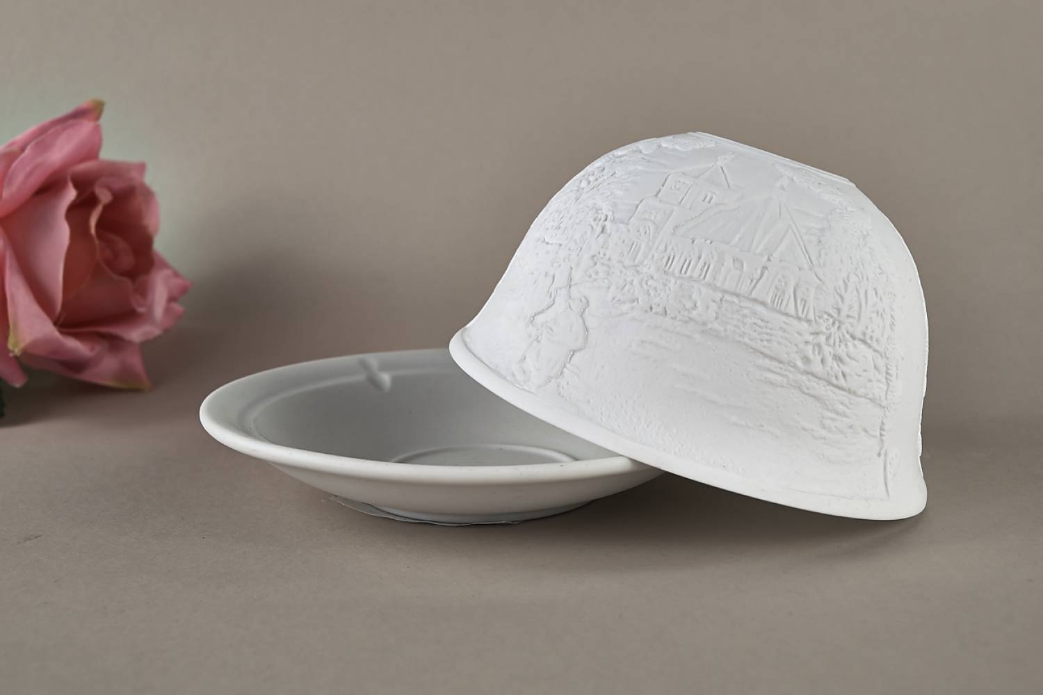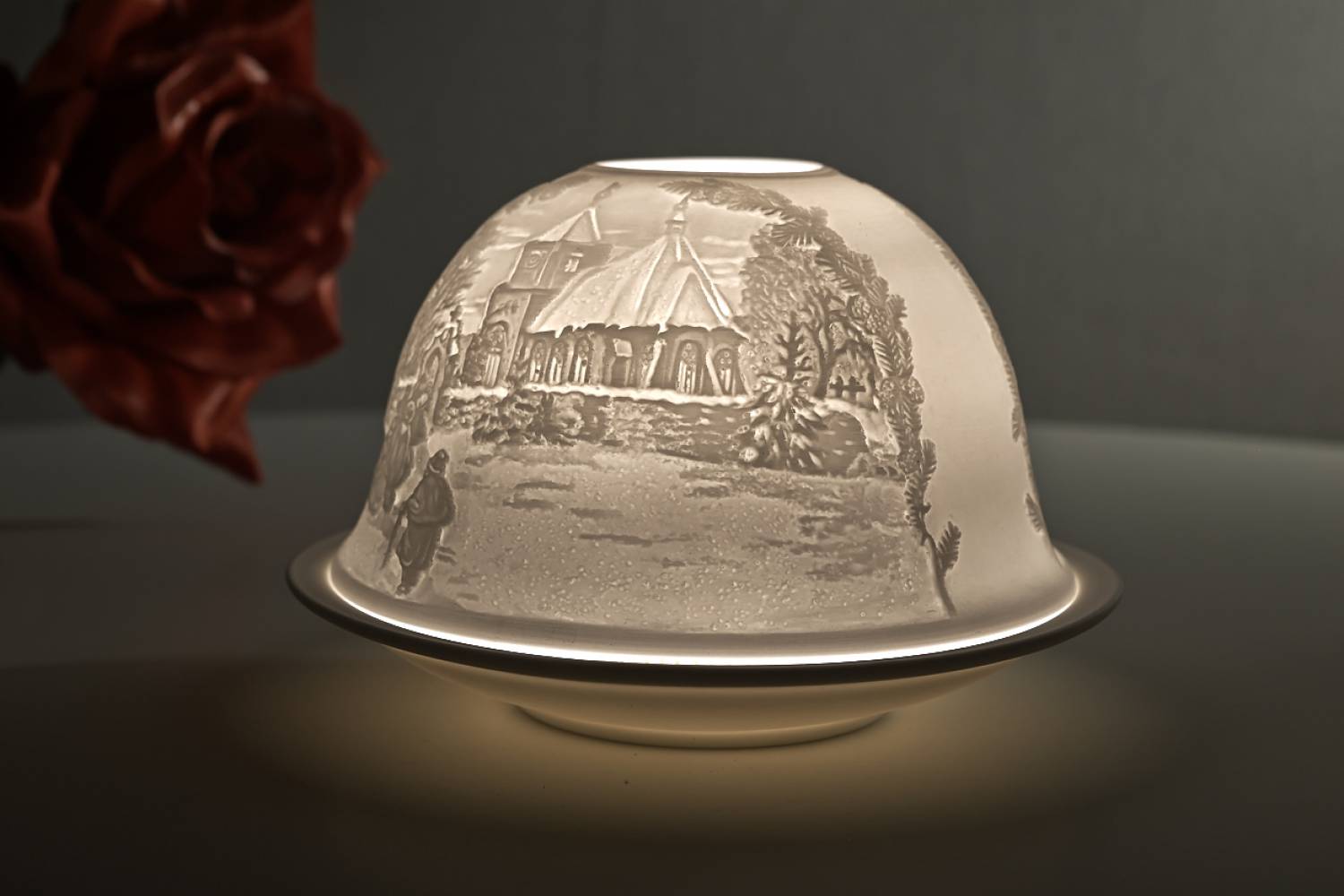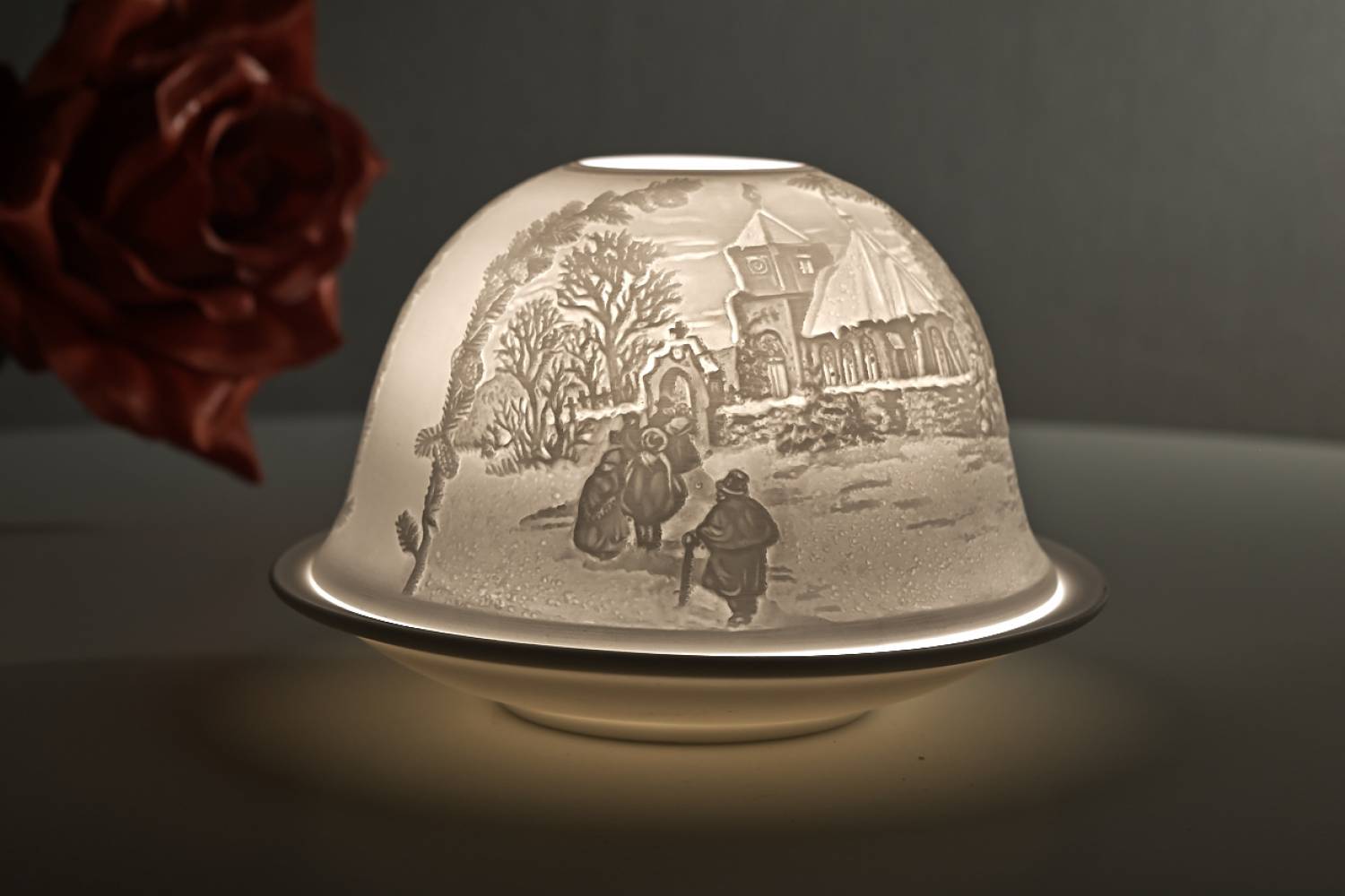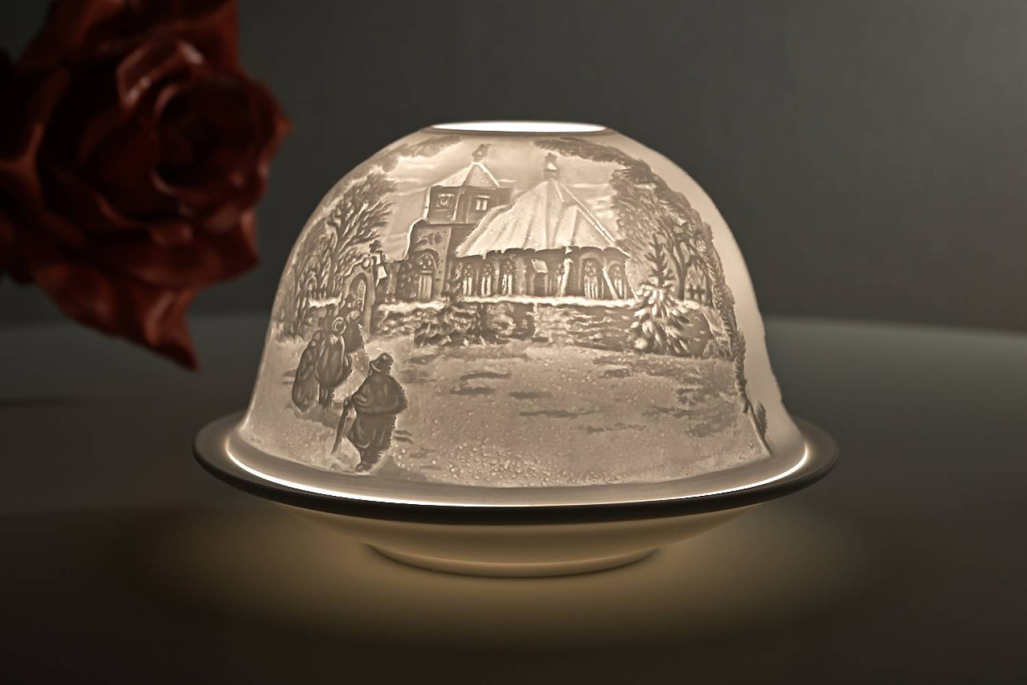 Christmette oder Christmesse - Dieser Teelichthalter aus Bisquitporzellan zeigt eine Ausschnitt eines nächtlichen Gottesdienstes.