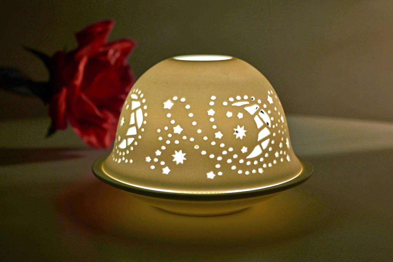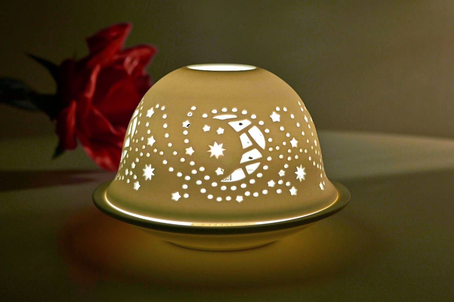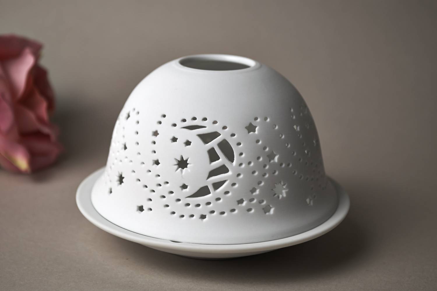Ein extravaganter Windlichthalter mit Druchbrüchen - Bei diesem Teelichthalter aus Bisquitporzellan strahlt der Mond ganz besonders.