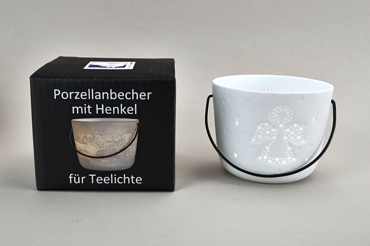 Toller dekorativer Windlichthalter als Becher mit Durchbrüchen die als Engel herausgearbeitet sind.