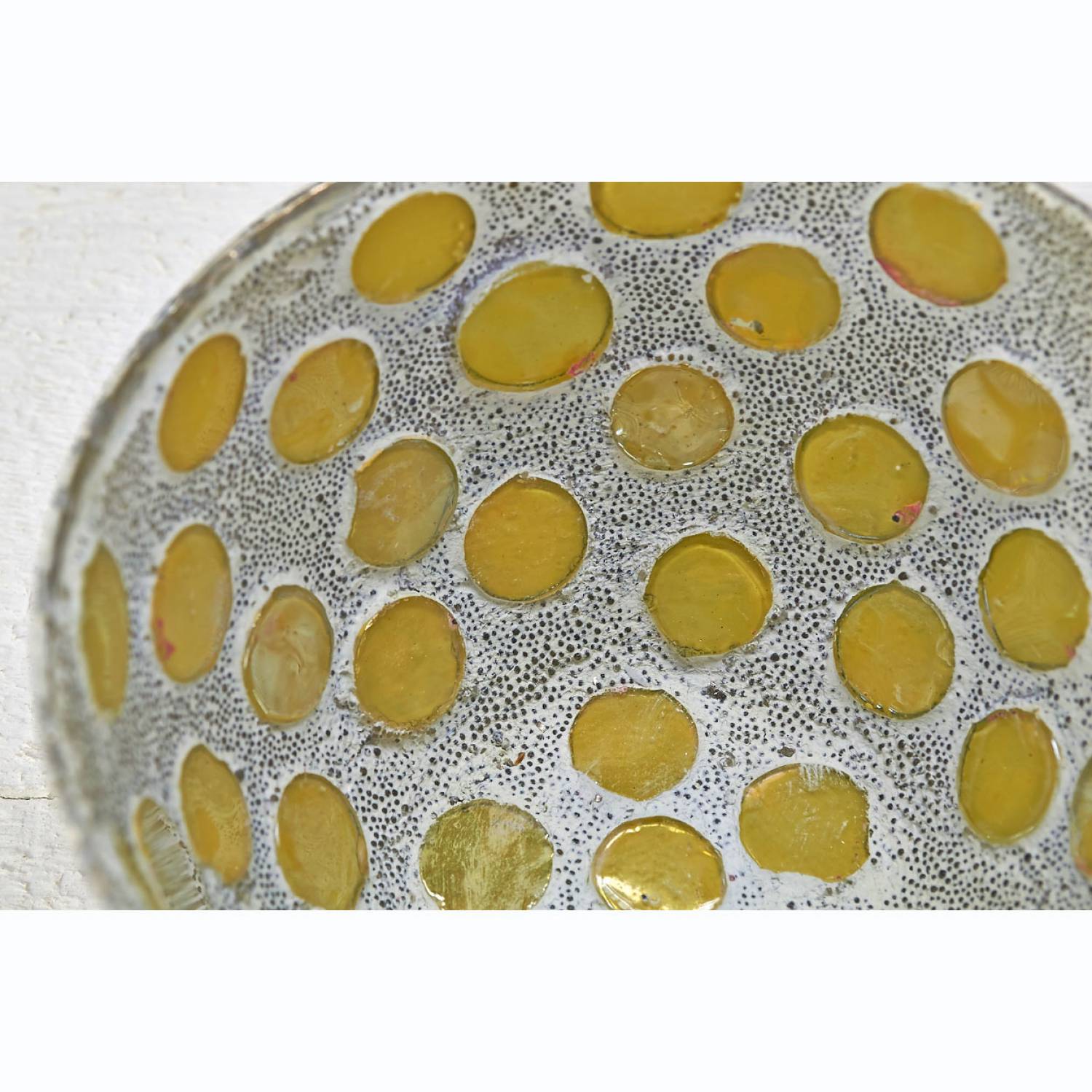 innen: grau/ weiße Sprenkel-Optik mit gelben Glasplättchen