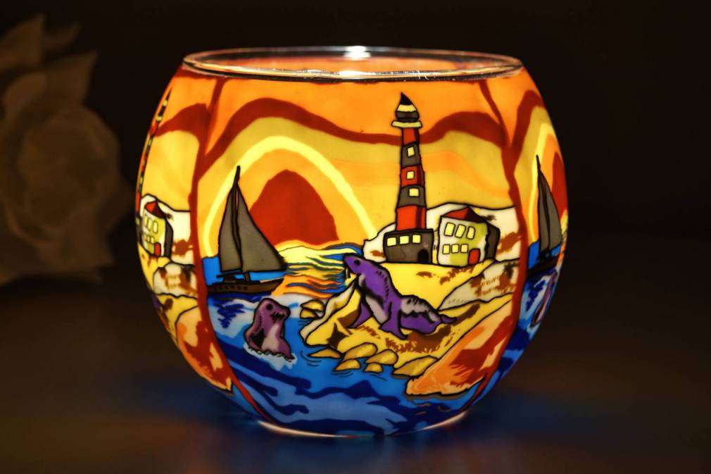 Kerzenfarm Leuchtglas mit einzigartigen, fantasievollen, farbigen Motiven.