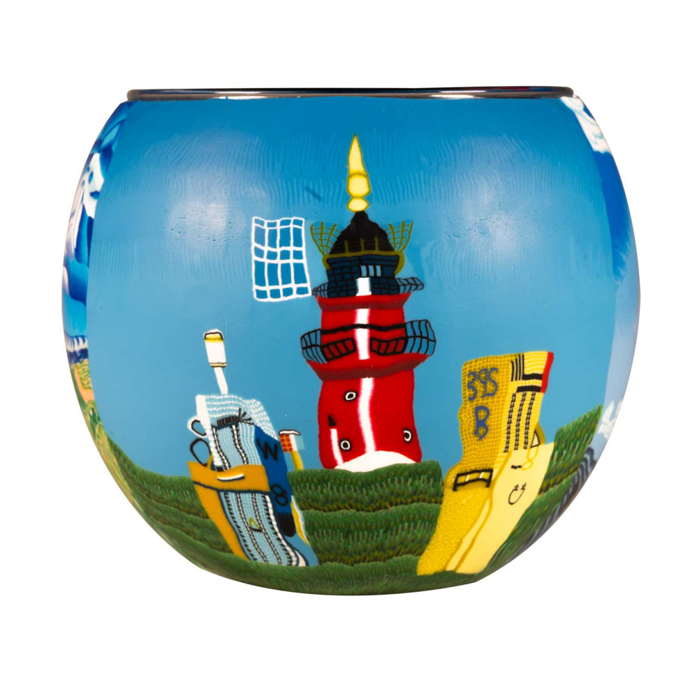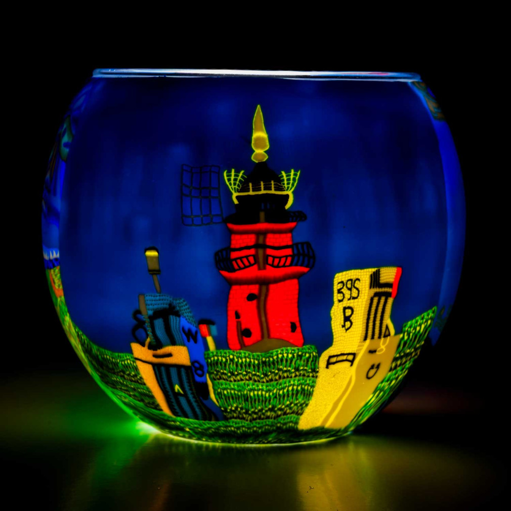 Sobald du ein Teelicht entzündest, entfaltet das Glas seinen vollen Zauber: Die Farben beginnen sanft zu leuchten, und das maritime Motiv erinnert an lange Spaziergänge am Meer, Wellenrauschen und Leuchttürme in der Abenddämmerung.