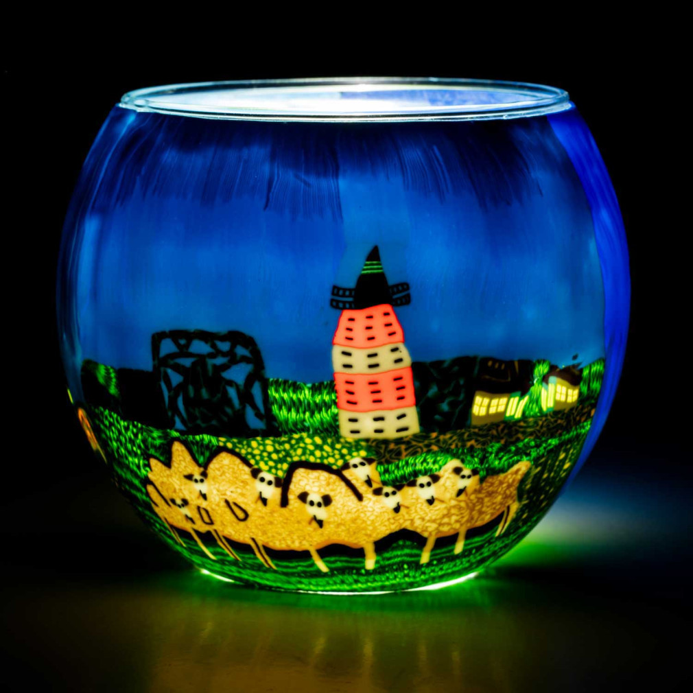 Kerzenfarm Leuchtglas mit einzigartigen, fantasievollen, farbigen Motiven.