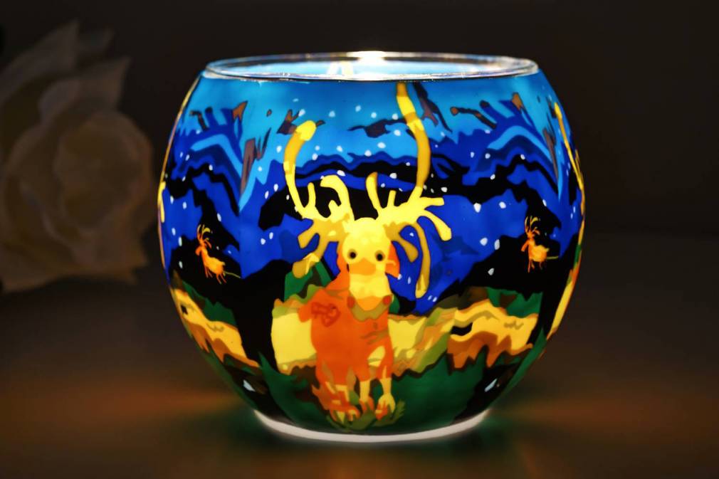 Kerzenfarm Leuchtglas mit einzigartigen, fantasievollen, farbigen Motiven.