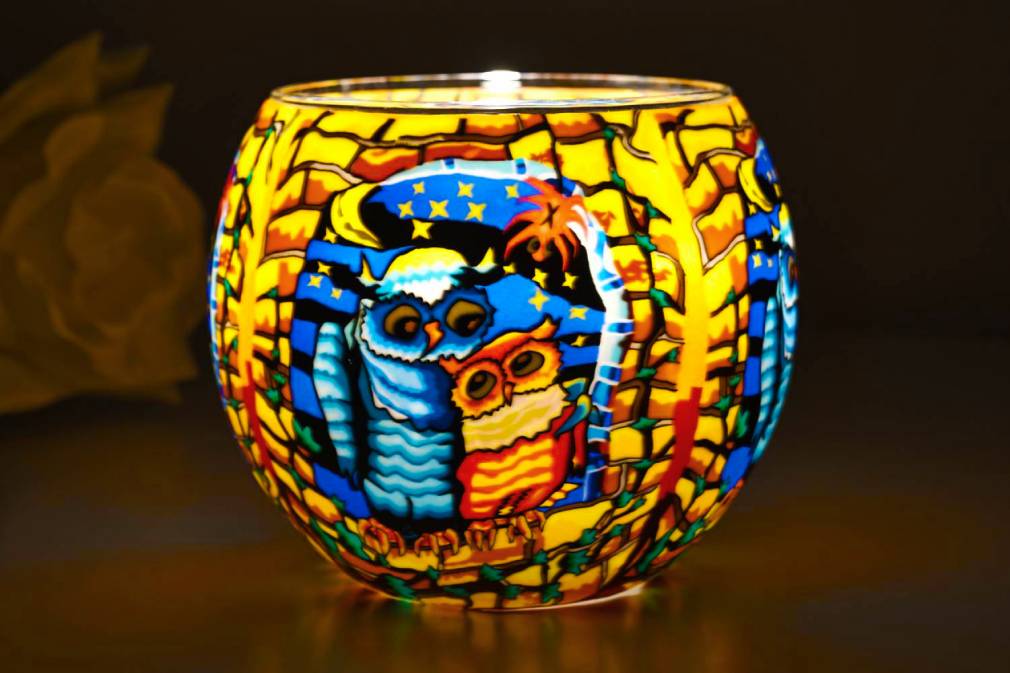 Kerzenfarm Leuchtglas mit einzigartigen, fantasievollen, farbigen Motiven.