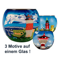 Bitte beachten Sie, dass die Leuchtgläser beim Fotografieren zur besseren Erkennung der Motive mit einer elektrischen LED-Lampe 1,4 W beleuchtet wurden. Beleuchten Sie das Leuchtglas mit einem Teelicht, ist dieses nicht so hell, wirkt dafür lebendiger und verbreitet eine gemütliche Atmosphäre.