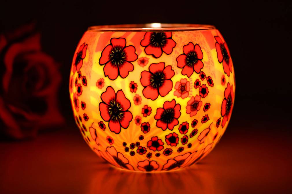 Die dominierende rote Farbgebung der Mohnblumen wird von einem goldgelben Lichtschein durchzogen, der an warmes Sonnenlicht erinnert. Sobald du ein Teelicht entzündest, erstrahlt das Glas in intensiven Rot- und Gelbtönen – wie ein Sommertag, eingefangen im Glas.