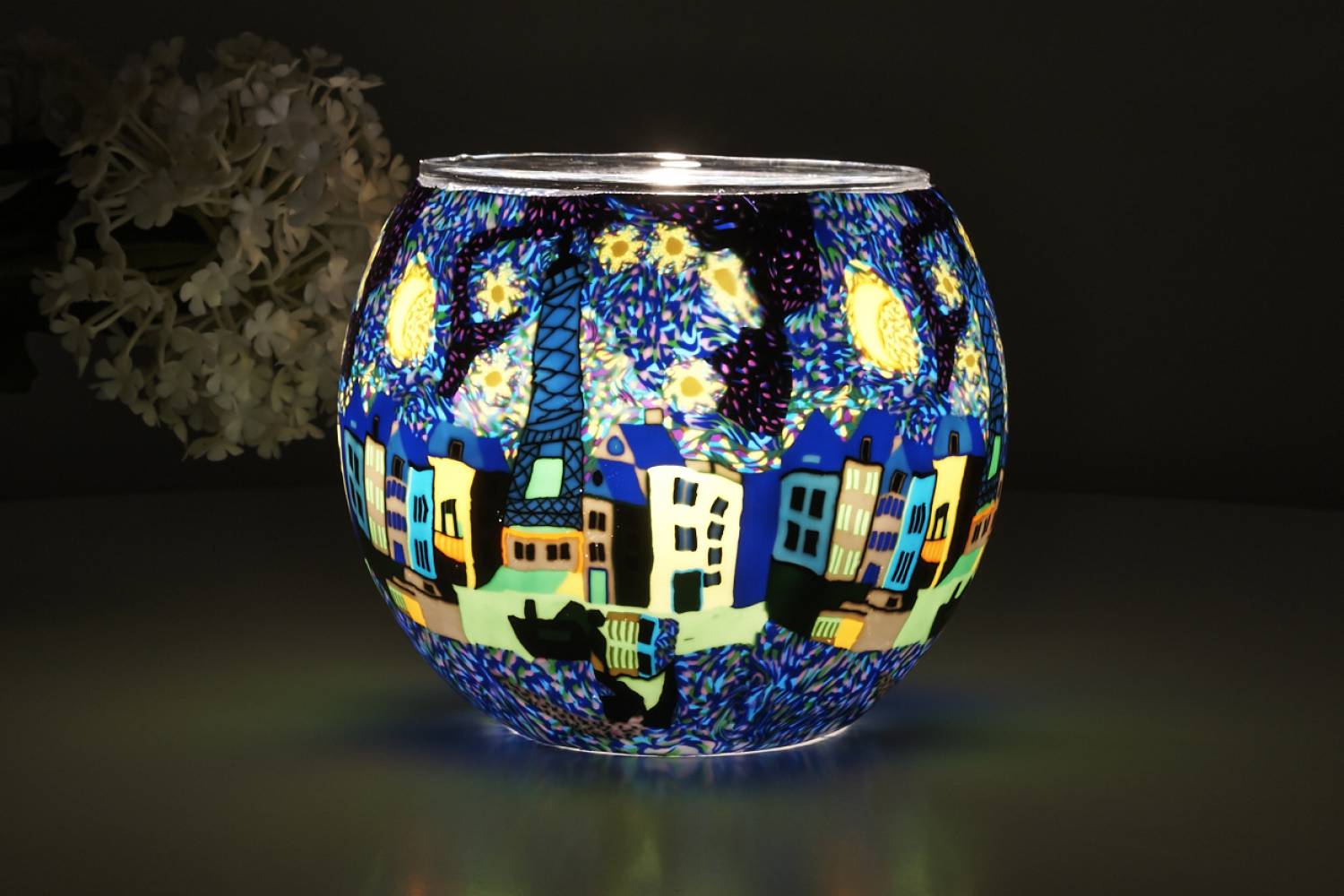 Im sanften Kerzenschein erstrahlt das Leuchtglas in warmem Licht, das die magische Stimmung einer Pariser Nacht einfängt.