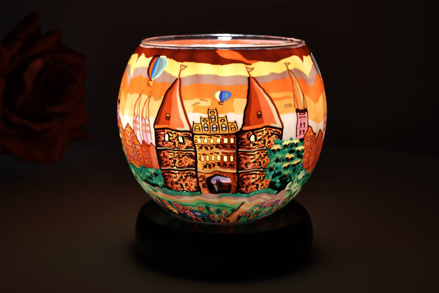 Dieses Leuchtglas zeigt Lübeck mit dem berühmten Holstentor, dahinter die charakteristischen Kirchen der Hansestadt. Über der Szene schweben zwei Heißluftballons, eingebettet in einen warmen, rotgoldenen Sonnenuntergang, der das Motiv strahlend zur Geltung bringt.