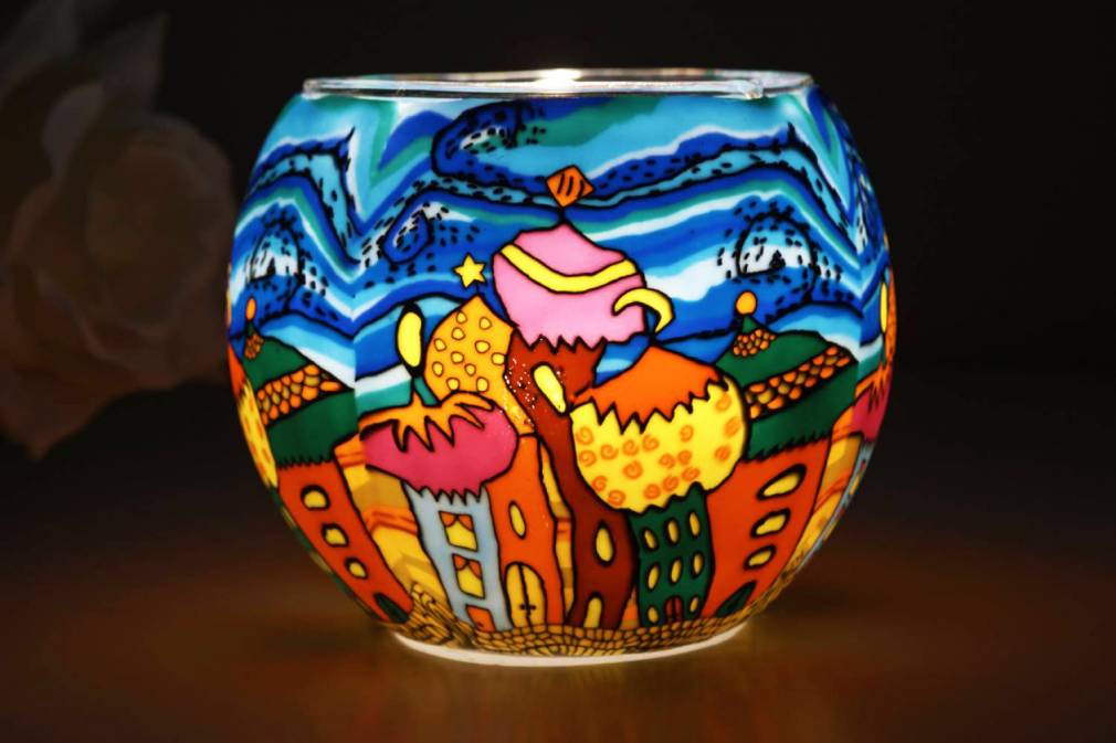 Kerzenfarm Leuchtglas mit einzigartigen, fantasievollen, farbigen Motiven.