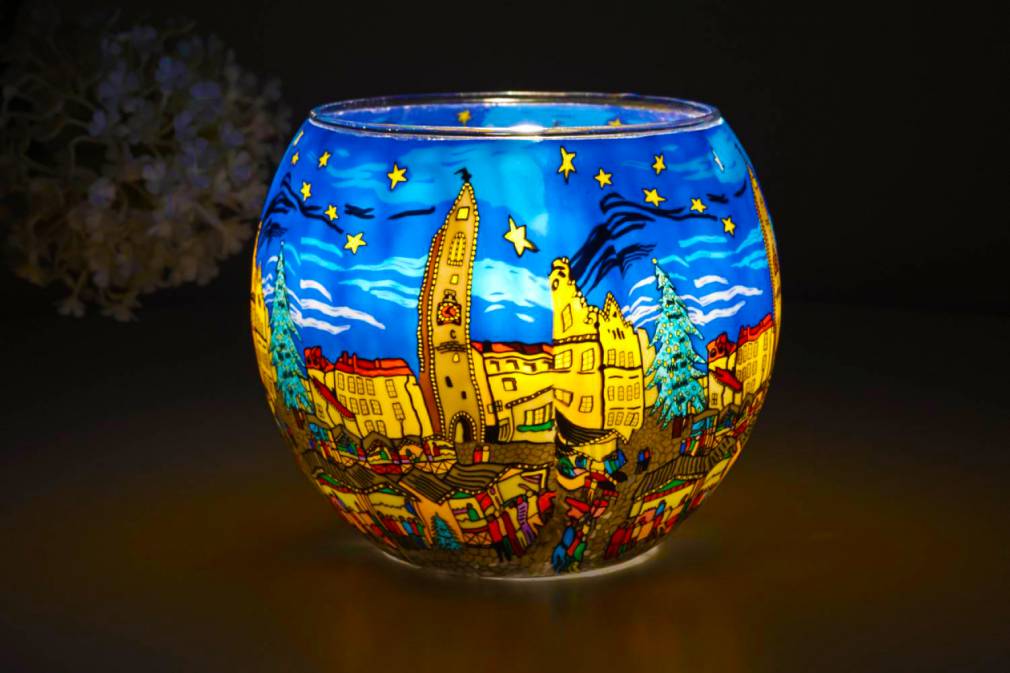 Kerzenfarm Leuchtglas mit einzigartigen, fantasievollen, farbigen Motiven.