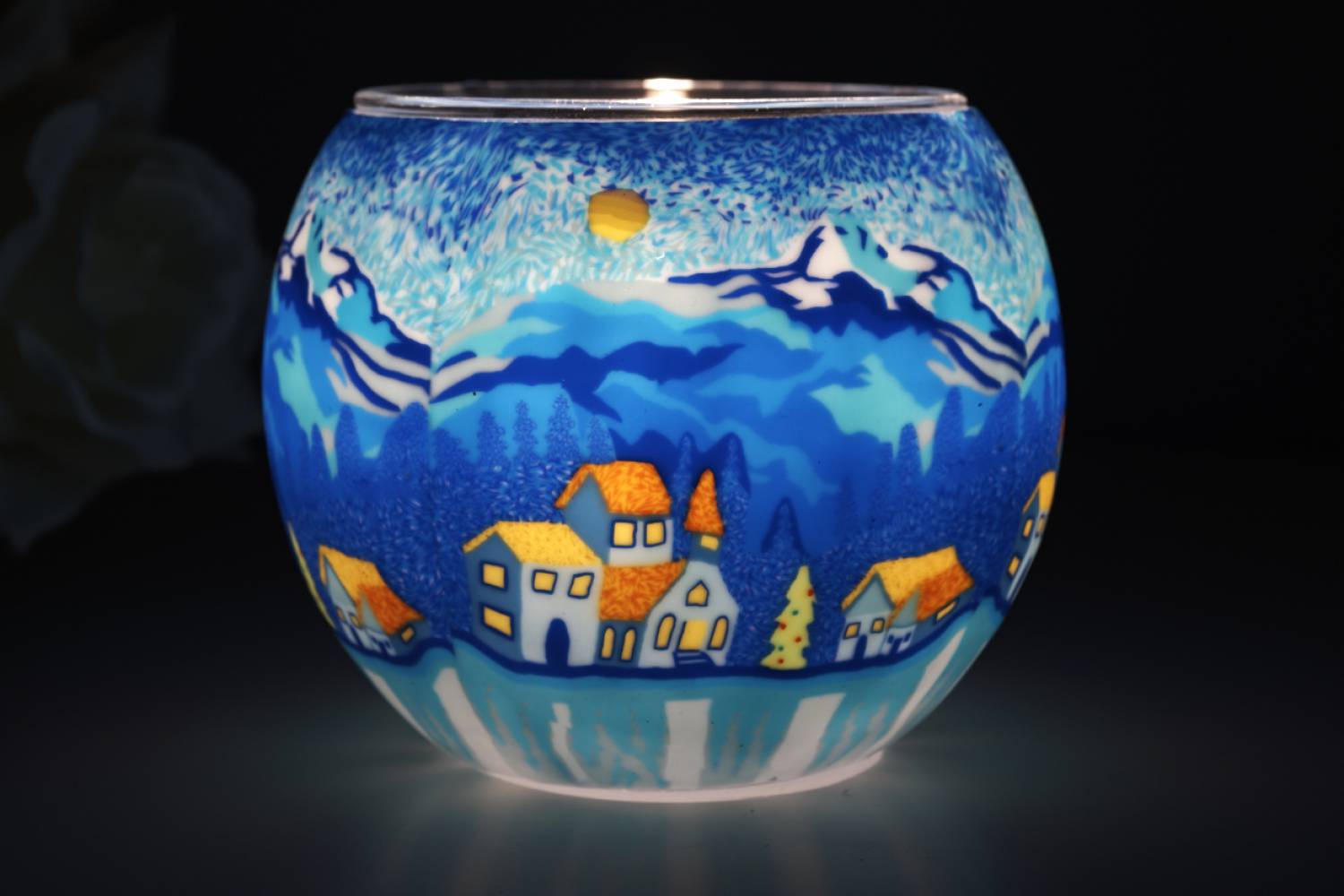 Dieses bezaubernde Leuchtglas fängt die Stille einer klaren Winternacht auf wunderschöne Weise ein.