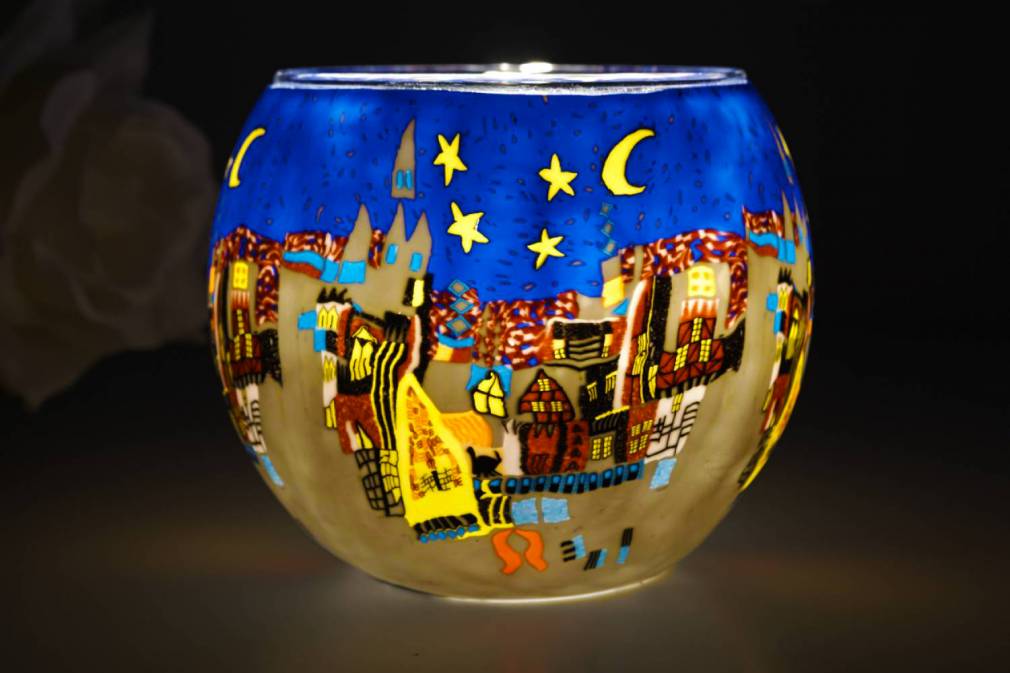 Kerzenfarm Leuchtglas mit einzigartigen, fantasievollen, farbigen Motiven.