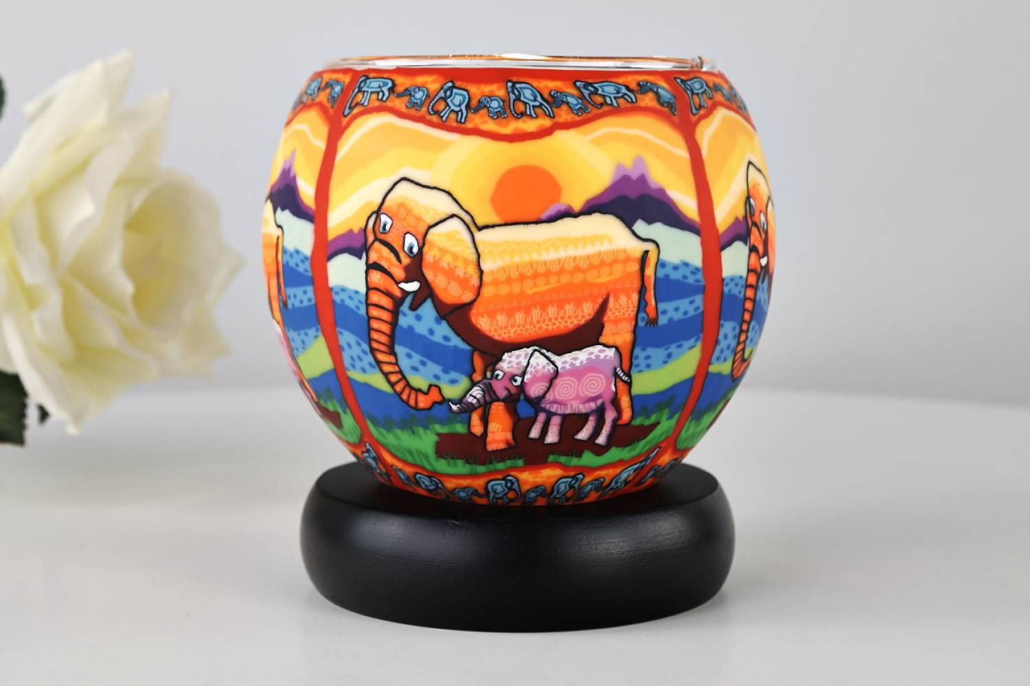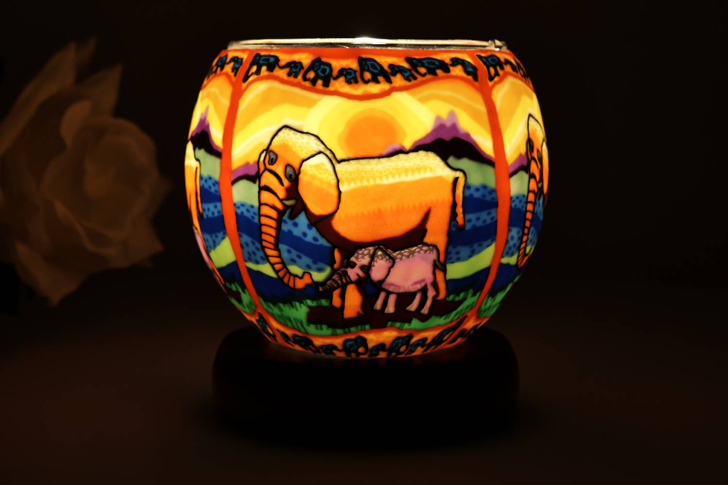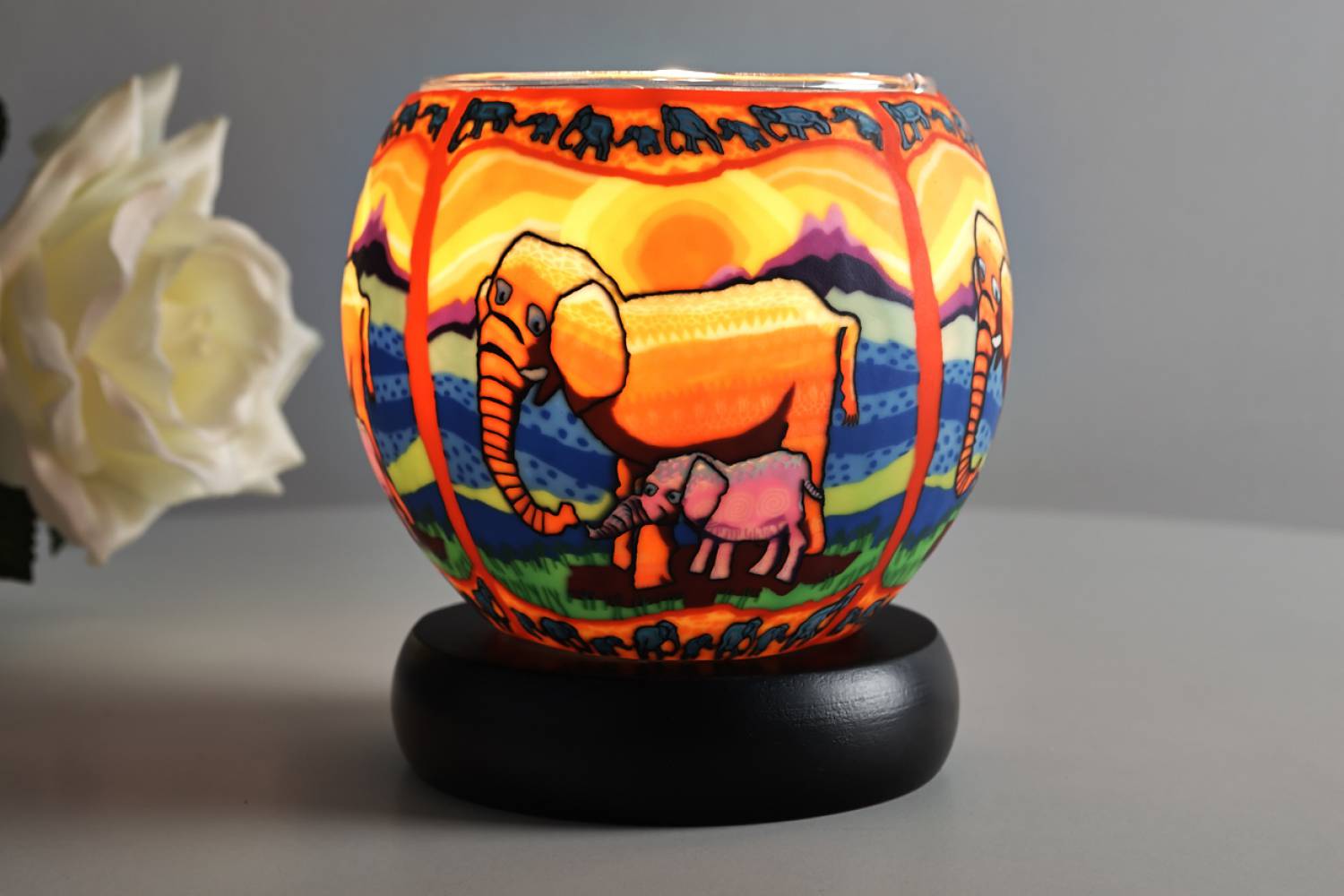Dieses Leuchtglas zeigt eine Elefantenkuh mit ihrem Elefantenbaby, dicht beieinander und liebevoll dargestellt. Die modellierten Formen verleihen dem Motiv eine sanfte Struktur, die im Licht besonders warm wirkt.