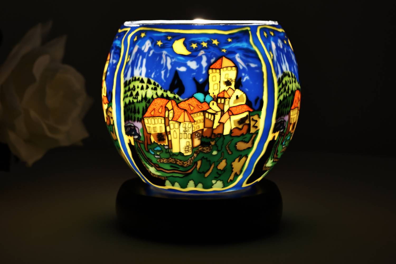 Dieses Leuchtglas zeigt ein malerisches Schloss in Tirol bei Nacht: