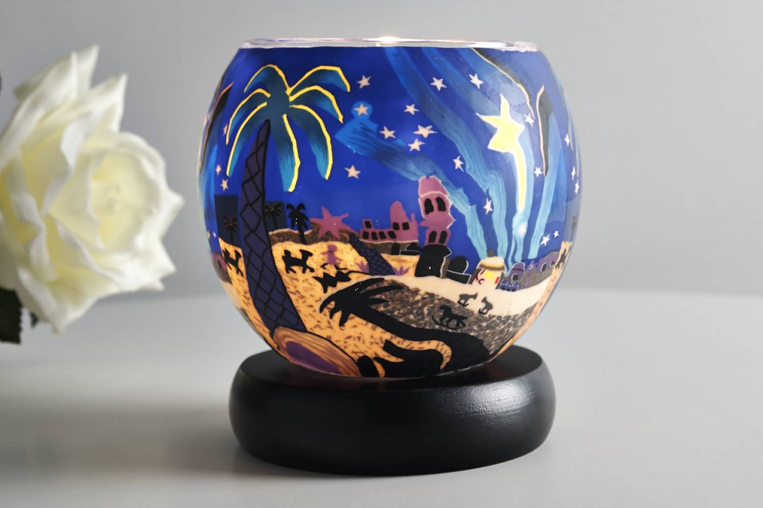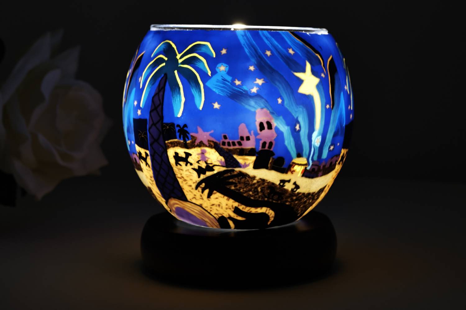 Das Leuchtglas „Bethlehem Krippe“ zeigt eine festliche Krippenszene in stimmungsvollem Licht. Es wurde eine Bohrung eingebracht, sodass das Glas auf einem schwarzen Sockel mit elektrischer Fassung aufgesetzt werden kann. Das Leuchtglas wird so elektrisch beleuchtet, wodurch die Szene sanft und gleichmäßig erstrahlt.
