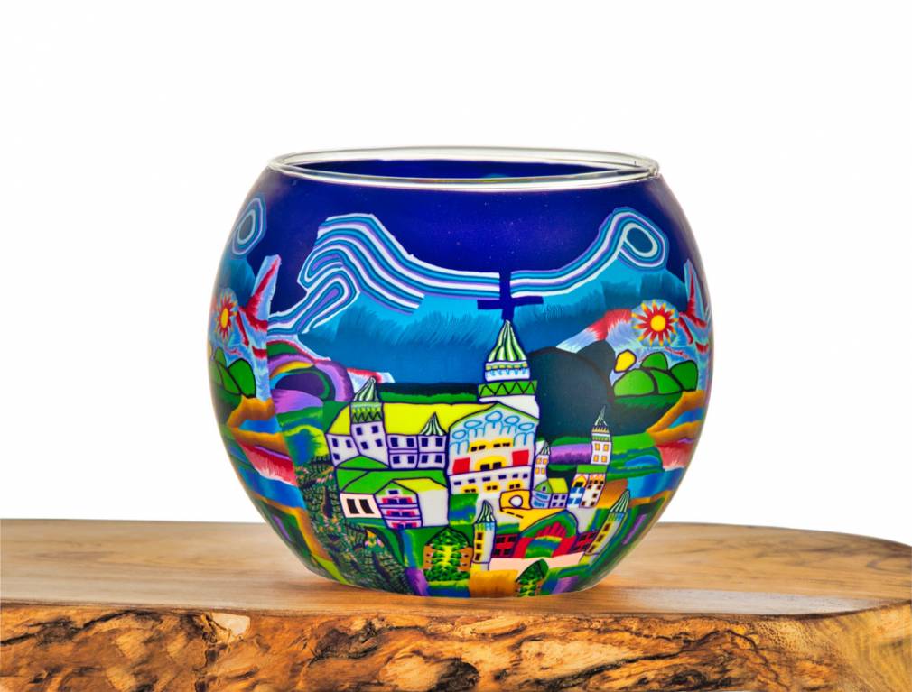 Dieses Leuchtglas zeigt ein sommerliches Stadtmotiv mit einer markanten Kirche im Zentrum. Die Hauptfarben Blau und Grün werden durch rote und gelbe Farbkleckse lebendig akzentuiert, die der Szene einen fröhlichen, warmen Charakter verleihen.