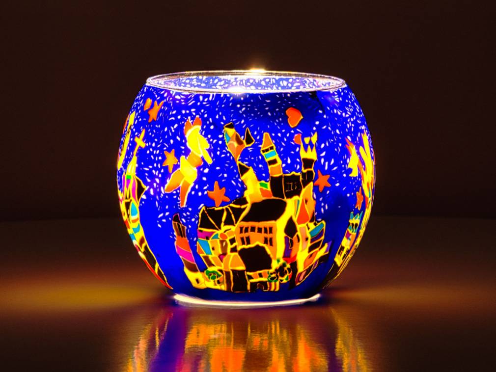 Die modellierte Oberfläche verleiht dem Glas Tiefe und Struktur, wodurch die Skyline lebendig wirkt. Bei Kerzenschein leuchten die Häuser, der Himmel und die Schneeflocken stimmungsvoll auf und schaffen ein gemütliches Winterlicht.