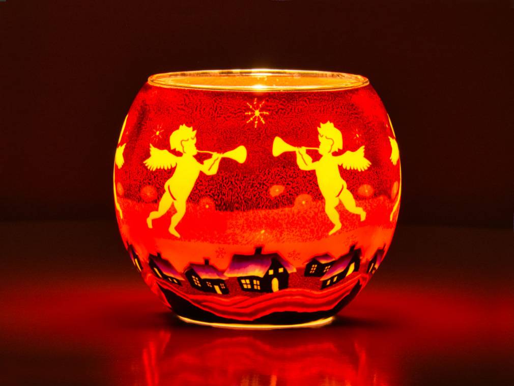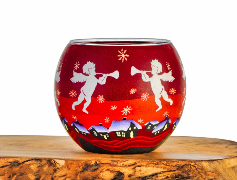 Dieses stimmungsvolle Leuchtglas zeigt Engel, die mit Posaune über einer nächtlichen Stadt schweben. Aus den Fenstern der stilisierten Häuser scheint warmes Licht, während Schneeflocken sanft über die Szene fallen. Das rote Motiv wirkt besonders festlich und leuchtet im Kerzenschein sanft und warm.
