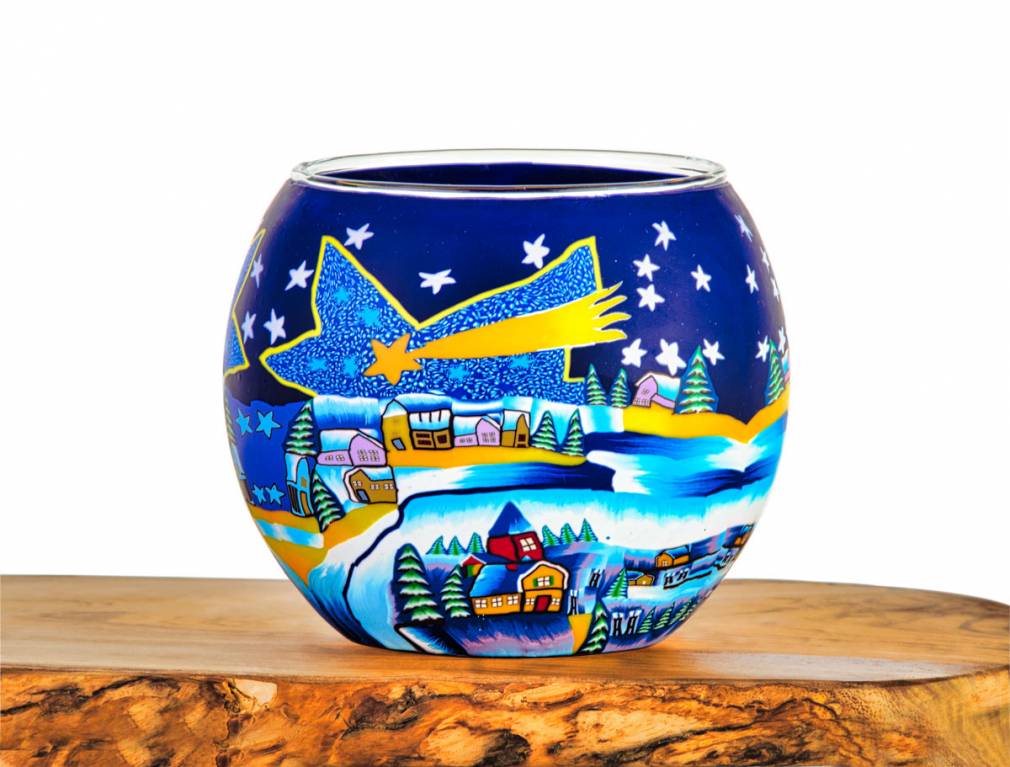 Die sorgfältig aufmodellierte Oberfläche bringt die Konturen der Häuser und des Sterns deutlich zur Geltung und lässt das Motiv bei Kerzenschein weich und lebendig wirken. Besonders im Dunkeln entfaltet das Leuchtglas seine volle Wirkung und sorgt für eine gemütliche, weihnachtliche Atmosphäre.