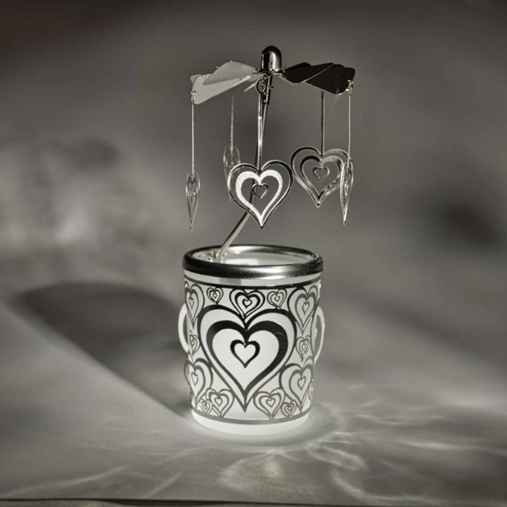 Romantisches Lichtkarussell: Glas-Karussell-Windlicht mit Herz-Motiv in Silber