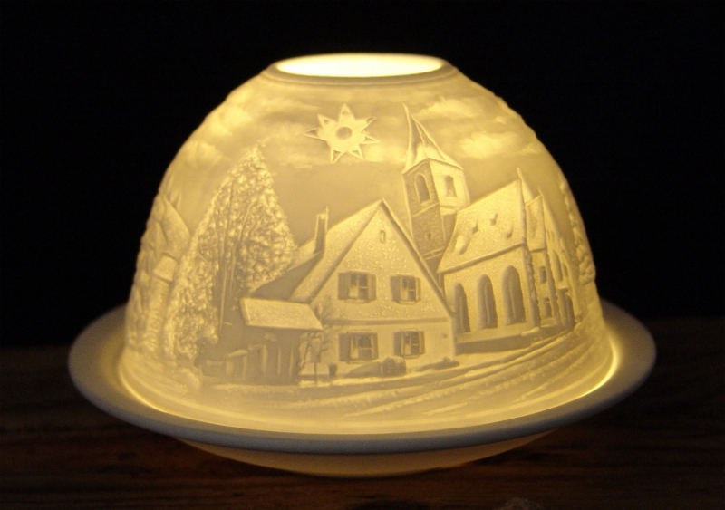 Die Lithophanie ist eine Methode verschiedene Schichten des Porzellans übereinander zu schichten und somit Reliefbilder zu erzeugen. Durch die unterschiedliche Lichtdurchlässigkeit und Schattenwirkung werden die Motive plastisch und bewegt abgebildet.